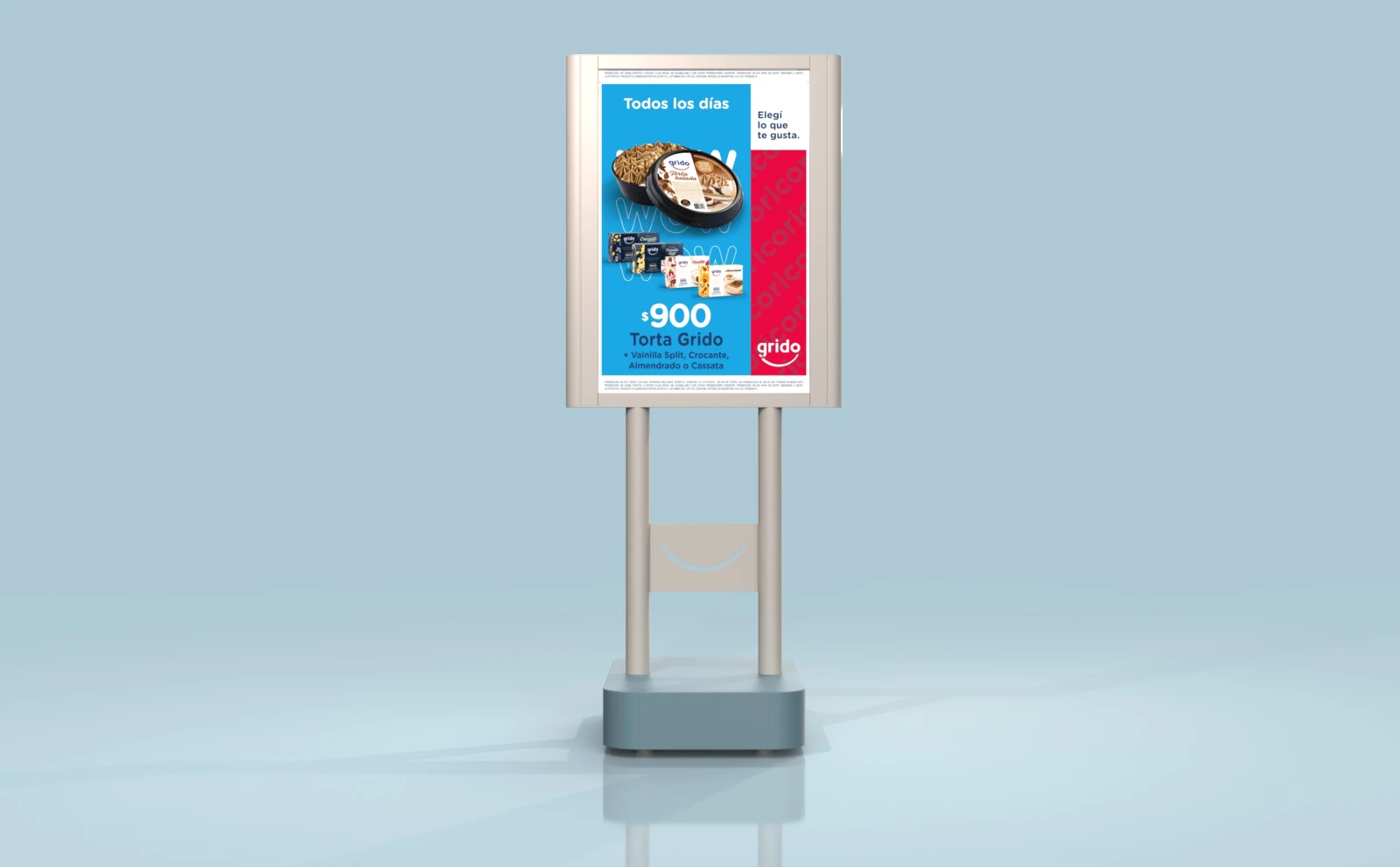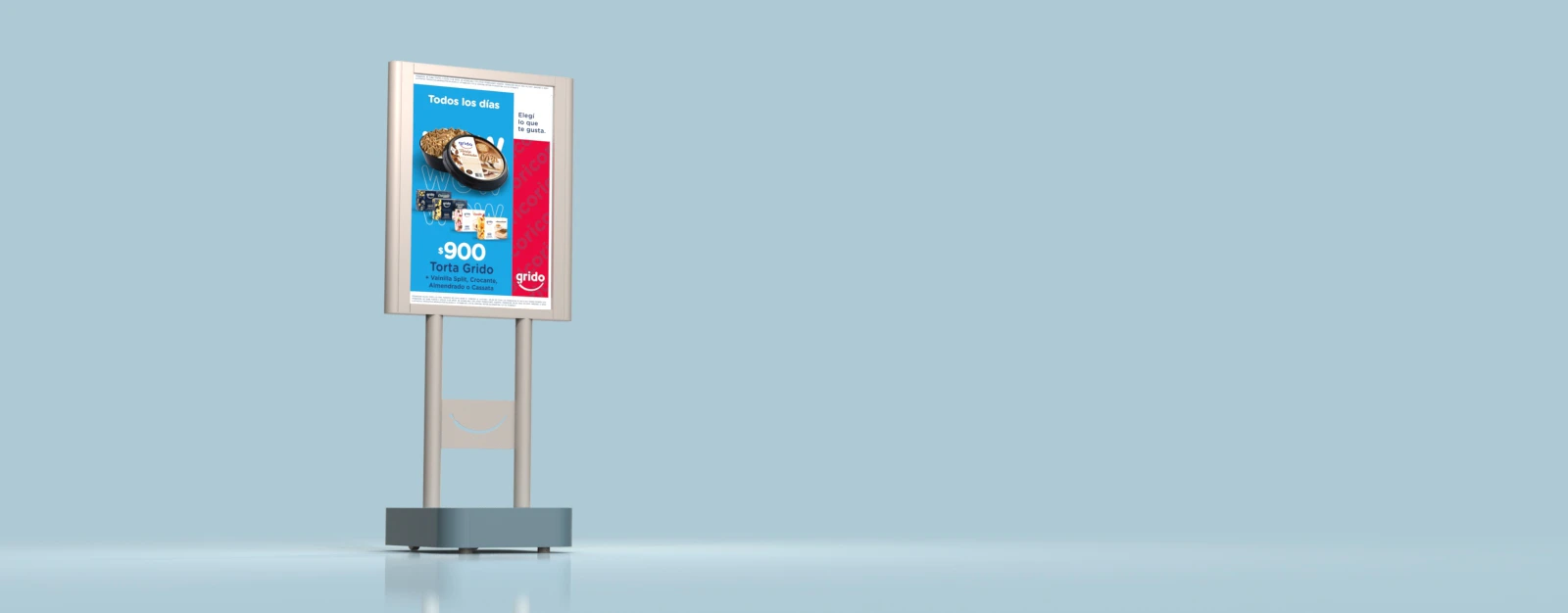 Este tótem movil busca aprovechar un espacio en la via publica durante el periodo de apertura del local, para mostrar -mediante vinilos intercambiables- la comunicacion gráfica requerida.
