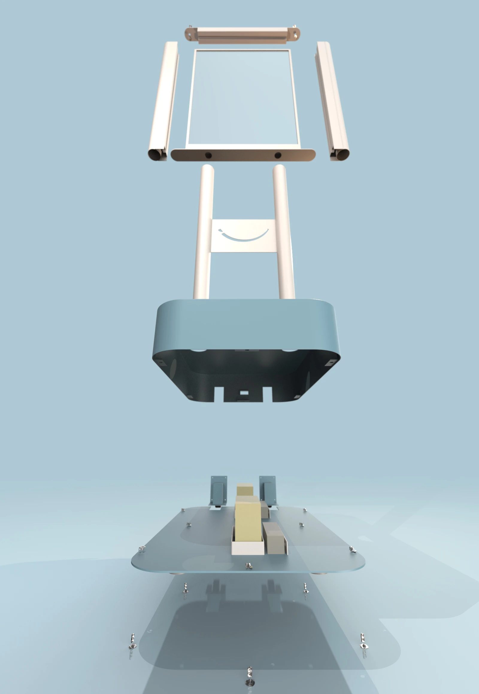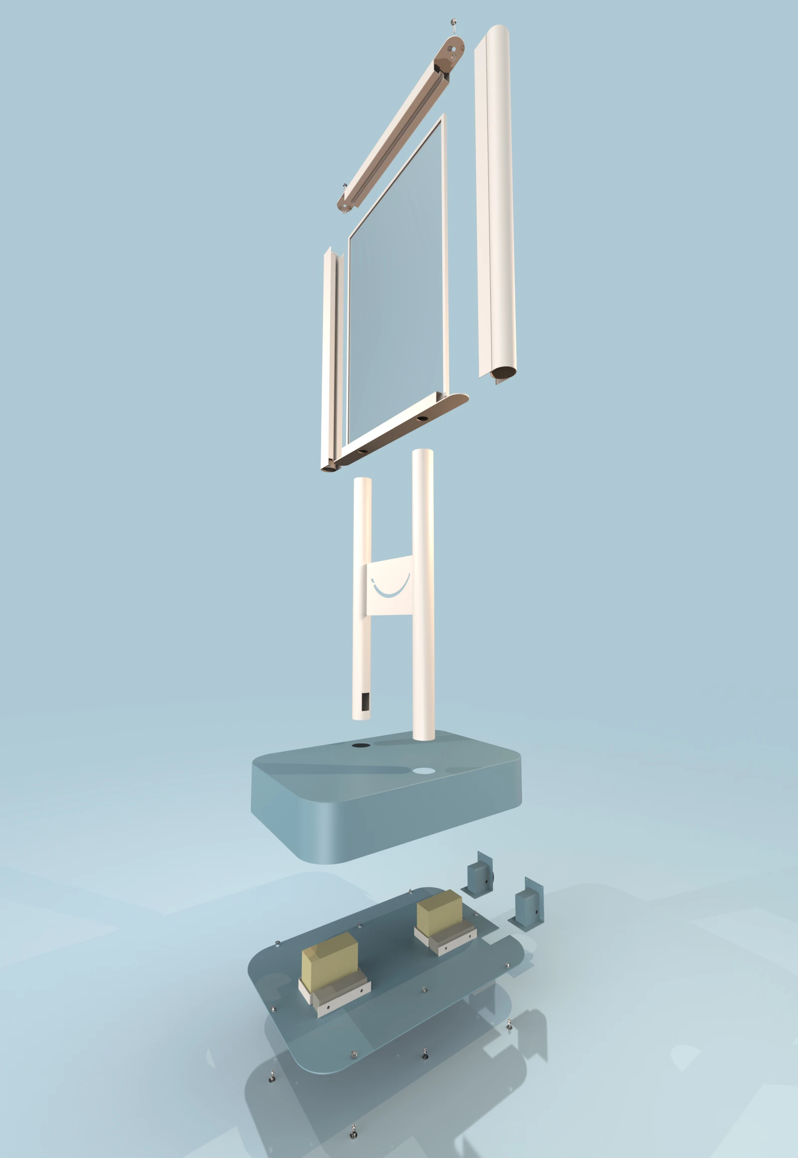 El producto debió cumplir con resistencia a condiciones climáticas exteriores (Rayos UV, lluvias ligeras, posibles vandalismos, por lo que se planteo la construcción entera en materiales duraderos, eligiendo recubrimientos superficiales aptos exterior: materiales metálicos, acrílico, piezas de goma/caucho